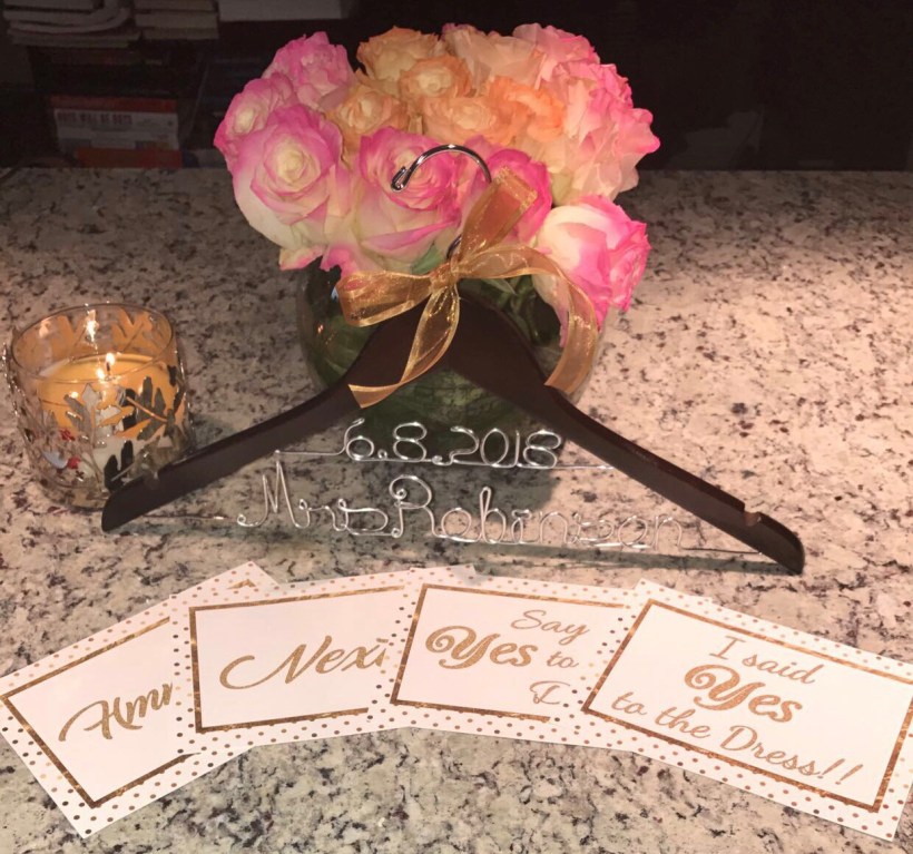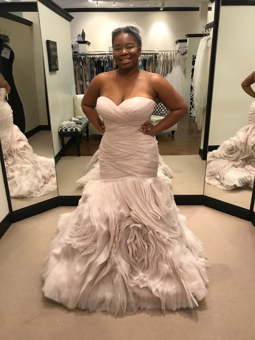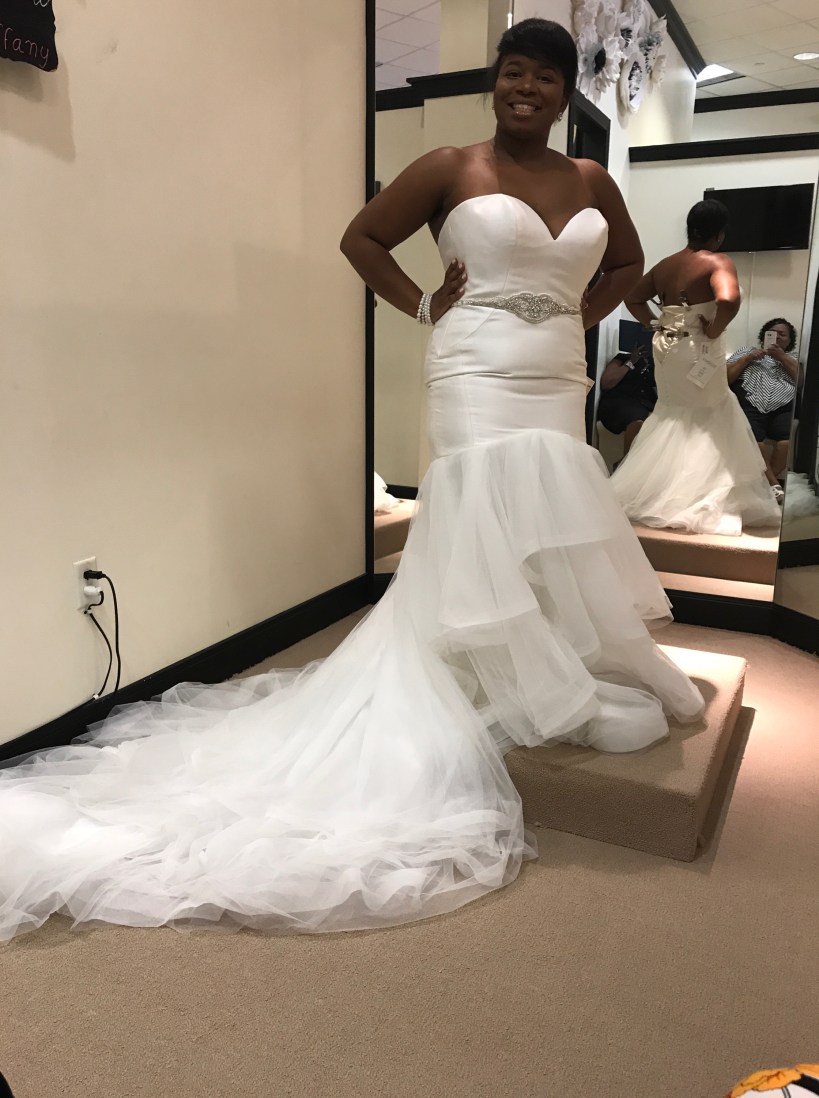 On Saturday, September 30th, I went dress shopping with my mother, wedding planner, and Matron of Honor, Heather. My sweet MOH flew in to Houston from Dallas just for this special moment, then immediately flew back to Dallas. She made cute signs with different phrases just for the occasion, and we had a glass of mimosa right before we started our day of dress shopping. She also gifted me with a personalized wedding date hanger, with my new last name, for my new dress. This was one of the most exciting and interesting days of my life. It was interesting because I didn’t know if I would find my dream dress that day. I had worked really hard on having my waist snatched for the fitting. I knew what style that I wanted but I had no clue what the dress would look like. Of course like most women, I looked online at a lot of dresses making a mental note about my likes and dislikes. I knew that I didn’t want a ball gown dress or a white dress. My personality and body shape just wouldn’t do a ball gown design any justice, and white just wasn’t for this non virgin woman. I guess I was a little non-traditional with that expectation.