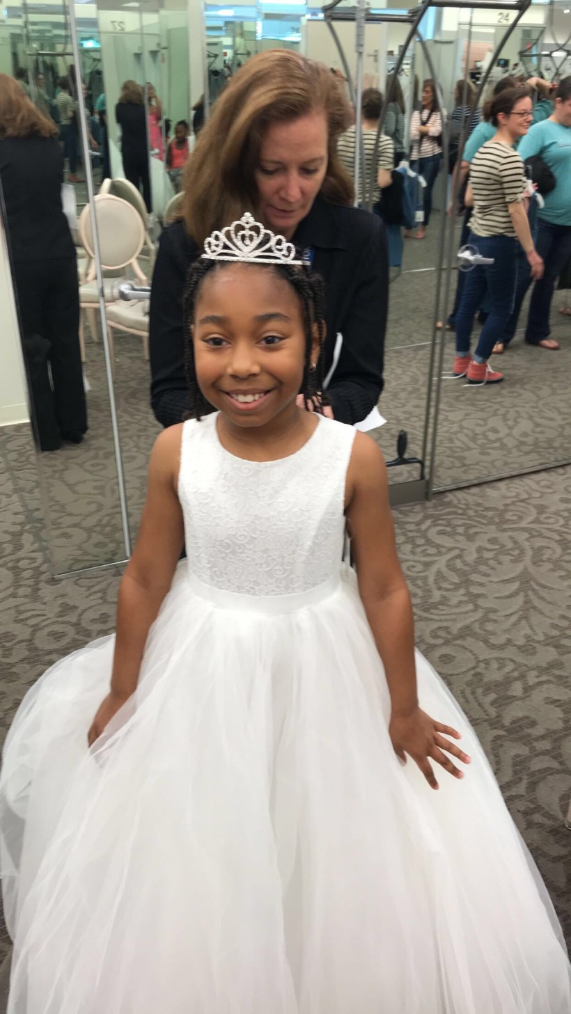 We’re 1 day away from Chris and I’s 2nd Wedding Anniversary. I wanted to share the precious moment when Crystal, my Bonus daughter, said yes to her dress. Chris and I thought it would be a great idea for Crystal to have a day with all of the attention on her. We wanted to do this because she was so sad that she couldn’t stay at my bridal shower because it was for adults only. She was so excited to see her friends Heather, Kate, Breanna, Sami & Willisa, that she wasn’t ready to leave. Throughout the planning process of our wedding, Chris made sure that Crystal understood that our wedding day was about her as well. We made sure she had key moments such as being my miniature bride, as well as her having a dance with her daddy.